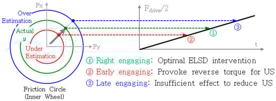 To reduce wheel speed feedback control intervention, the accuracy of the wheel spin predictive control can be improved by predicting the friction coefficient of the road surface. The prediction model for the allowable driving force is based on the road-friction coefficient; thus, an accurate estimation of the tire–road friction is required. If a tire–road friction estimation error occurs and the estimated value is smaller than the actual, as shown in Figure 10, the ELSD control intervenes before the optimal time, which means that the clutch is engaged before the inner wheel spins. It can cause the opposite effect, which increases the understeer as a result of limited side differential effect in no wheel spin condition. Conversely, if the estimated tire–road friction is larger than the actual tire–road friction, the amount of understeer control may be insufficient during inner-wheel slip because of the delay in the ELSD operation.