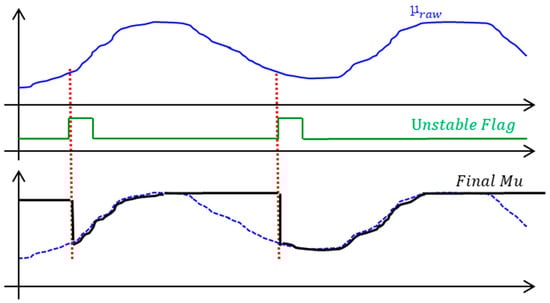 Figure 13 presents the unstable status flag and friction values with respect to time. The unstable status flag is represented by the green line. The friction coefficient calculated in real time is illustrated by a blue line. A black line represents the friction coefficient estimated at the end.