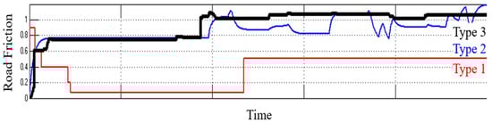 The above method was used to increase the tire–road friction estimation accuracy while also resolving the problem of underestimating the tire–road friction value during normal grip driving conditions, as shown in Figure 13 and Table 2.