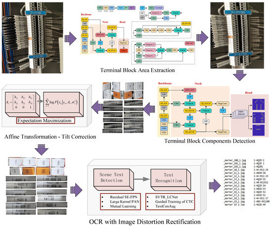 An example of the recognition results is shown in Figure 11, based on an actual photograph of a terminal block. The original photo in the figure is significantly affected by the background. After area localization using YOLOv7-AO, irrelevant background areas and severe distortions and obstructions on the left side of another terminal block are effectively eliminated. In the second layer of the model, DB is introduced. The YOLOv7-DBAH model, tailored for detecting small physical entities of terminal blocks, is used to locate all physical object boundary points under distorted shooting angles accurately, achieving good results. Finally, perspective technology is used to correct the distorted text information, enabling complete physical entities recognition.