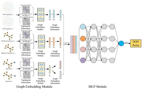Based on the aforementioned approach, in order to consider the matched nodes and the whole graph information fully, the graph convolution network is used to embed the node subgraph information in the topological graph that has been matched, which are denoted as and , respectively. The information of the whole topological graph is denoted as and through the embedding network. Each state can thus be represented as . The node information corresponding to the action space can be represented as after passing through the embedding function. The corresponding Q-value (Equation (1)) can be represented by the MLP network as follows: