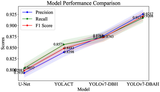 In Section 2.2, we introduced a model specifically designed for recognizing the physical entities of terminal blocks. To evaluate the target detection performance of the YOLOv7-DBAH model, we conduct comparative experiments using the same test data. The results, which encompass a comprehensive comparison of category indices, are presented in Figure 10 and Table 5.