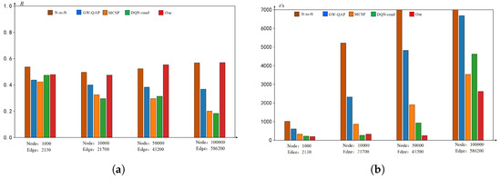 As seen in Figure 13a, when the scale of the nodes is small, all algorithms perform similarly in terms of the R metric. The operational outcomes are all closely aligned with the N-to-N strategy. As the node scale increases, the performance of the DQN-rand, MCSP+RL, and GW-QAP models gradually deteriorates. These three models exhibit weak adaptability to large-scale topological graphs. When the Q-scores of the DQN network are replaced by random numbers, the optimization results cannot be fed back into the network input, causing the model to degrade to the original MCS framework. This further substantiates the effectiveness of the algorithm proposed in this paper. Note: the N-to-N strategy has not been fully executed when the node scale exceeds 50,000.