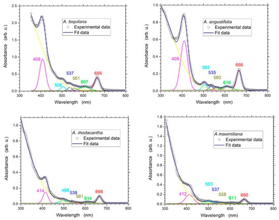 UV–Vis absorbance spectra analysis of the ethanolic extracts of A. angustifolia, A. maximiliana, A. rhodacantha, and A. tequilana from 300 to 800 nm.