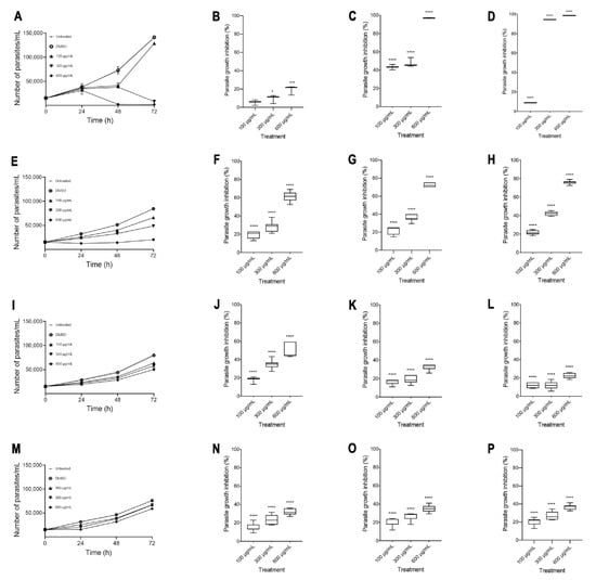 Extracts of Agave inhibit E. histolytica growth. Growth inhibition curves of A. tequilana (A), A. angustifolia (E), A. rhodacantha (I), and A. maximiliana (M). Percentages of inhibition at 24 h of A. tequilana (B), A. angustifolia (F), A. rhodacantha (J), and A. maximiliana (N). Percentages of inhibition at 48 h of A. tequilana (C), A. angustifolia (G), A. rhodacantha (K), and A. maximiliana (O). Percentages of inhibition at 72 h of A. tequilana (D), A. angustifolia (H), A. rhodacantha (L), and A. maximiliana (P). The boxes represent the 25–75th percentiles, and the medians are indicated. The whiskers show the range. Data are representative of at least three independent experiments and represented as mean ± SEM values. * p ≤ 0.05, *** p ≤ 0.0005, and **** p ≤ 0.0001 compared to the control group (DMSO-treated cells).