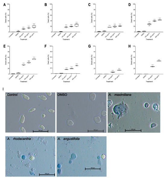 Percentage inhibition of viability due to the effect of Agave ethanolic extracts in E. histolytica. A. angustifolia at 24 h (A) and 48 h (B), A. rhodacantha at 24 h (C) and 48 h (D), A. maximiliana at 24 h (E) and 48 h (F), and A. Tequilana at 24 h (G) and 48 h (H). Inverted optical microscope (Nikon Eclipse Ts2) pictures of trypan-blue-stained trophozoites after DMSO or Agave extract treatment (600 µg/mL, 48 h) (I). The boxes represent the 25–75th percentiles, and the medians are indicated. The whiskers show the range. Results were obtained from three experiments independently using the triplicate SD. **** p ≤ 0.0001. Bar = 100 µm.