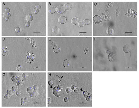 Inverted optical microscope (Nikon Eclipse Ts2) pictures of trophozoites treated with ethanolic extracts of Agave. Untreated trophozoites (A) and those treated with 0.4% DMSO (B). A. Tequilana (C), A. angustifolia (D,E), A. rhodachanta (F), and A. maximiliana (G,H). White arrows indicate alterations in nuclei. Black arrows indicate filopodial protrusions. Bar = 50 µm.