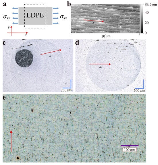 Low-density polyethylene (LDPE) film was chosen as the substrate, which is hydrophobic, is a non-polar, flexible material and is chemically resistant to both acidic and basic solutions. It is commonly used for packaging and as an insulating material but is also of increasing importance in biomedical applications [31]. However, another hydrophobic substrate with axial asymmetry, e.g., with a parallel-fiber structure, can be used. In the case of thin LDPE film, such an asymmetry is obtained by stretching the film in one direction—say, the x-direction, as shown in Figure 1a,b. In the examples shown, 1 cm of the film has been stretched to 5 cm. The process of self-assembling magnetic nanoparticles on an unstretched film is very random and the ring structures are very fuzzy. The method of preparing a multi-ring structure of magnetic nanoparticles [27] has been extended to include the ability to remove the core (the spot in the center part of the droplet deposit in Figure 1c) formed from excess magnetic nanoparticles in the drying droplet, so that only chains of nanoparticles remain on the substrate (Figure 1d). In addition, Figure 1e shows the possibility of preparing rectilinear chains of magnetic nanoparticles. It should be noted that the removal of the excess magnetic liquid in the drying droplet can be done at any time. For this purpose, this excess can be removed with a pipette or perilstatic pump (the methods used in this work) and suitable hygroscopic material. The time needed for the formation of subsequent nanoparticle chains as the magnetic-liquid droplet dries is several seconds (see also [27]) under ambient conditions.