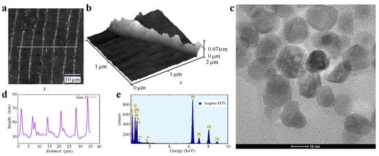Figure 2 shows AFM images with details of the topography of the magnetic-nanoparticle chain arrangement in the 2D structure, and TEM-microscopy images enriched with elemental analysis of the prepared magnetic nanoparticles. The nanoparticles were coated with APTES. Elemental composition analysis was performed on a copper grid with the help of the EDX method.