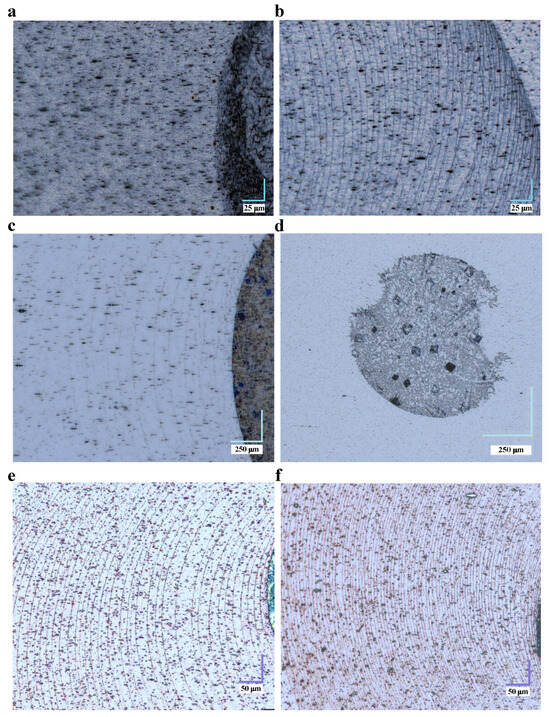 Optical-microscopy images of the stains from a droplet of magnetic liquid dried on a stretched LDPE film for different parameters: (a) For the concentration 0.012 mg/mL of magnetic nanoparticles at zero concentration of NaCl salt. (b) The same as in (a) but for the nanoparticle concentration 0.045 mg/mL. (c) For the magnetic nanoparticle concentration 0.045 mg/mL at the concentration of NaCl salt equal to 0.2 mM. (d) The same as in (c) but for the salt concentration of 20 mM. (e,f) For different values of the external magnetic-field gradient for the same magnetic-nanoparticle concentration 0.045 mg/mL, respectively, in the absence of a magnetic field and when the droplet dries in the presence of a neodymium magnet (the residual magnetic-flux density T) placed at a distance of 2.5 mm below the LDPE film.