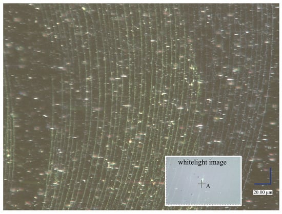 Fluorescence effect under white light from optical microscopy of fluorescein-coated magnetic-nanoparticle chains. The fluorescein comes from a dried droplet of a solution containing fluorescein laid on a substrate with chains of magnetic nanoparticles. The inset in light color is an optical-microscope image from a Raman spectrometer on which point A is marked for Raman spectroscopy analysis.