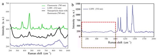 Figure 5a shows fragments of Raman spectra for pure fluorescein, LDPE film and a chain of magnetic nanoparticles coated with fluorescein. These fragments correspond to the Raman shift range from 200–1000 cm−1 where the spectrum for LDPE in Figure 5b is flattened. These results confirm the presence of fluorescein on the magnetic-nanoparticle chains.