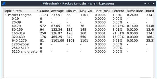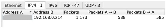 In the course of the experiment, a total of 1173 packets were exchanged, as illustrated in Figure 4. There were multiple conversations during the exchange, shown by the multiple TCP three-way handshakes present in the capture log. The connection was established, several packets were exchanged, and then the connection was closed. The TCP three-way handshake duration was between 4.193681 and 16.477670 ms (with the SYN -> SYN ACK duration between 0.02004 and 0.11177 milliseconds, and the SYN ACK -> ACK duration between 4.147911 and 16.45667 ms). A range of 18 to 21 TCP segments (with the connection management packets included) were transmitted between nodes until the connection was closed. The connection duration was between 17.372734 and 28.115327 ms. Among the TCP traffic, UDP packets were also captured. The UDP packets were usually exchanged after the TCP connection was closed; if this was not the case, they were always exchanged after the connection was set up. The UDP streams were of different lengths and were not necessarily between two TCP connections.