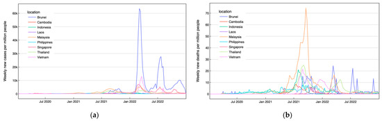 (a) Weekly confirmed cases per million people and (b) weekly confirmed deaths per million people in ASEAN countries over three years.