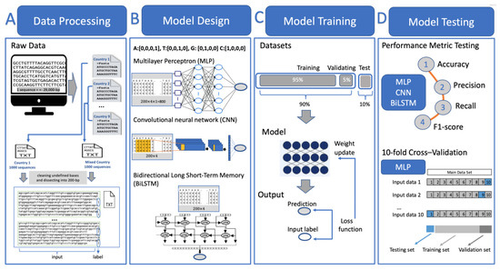 Figure 3 demonstrates the workflow of deep learning models used for classifying COVID-19 DNA sequences based on their country of origin. During the data processing phase, the sequences were initially downloaded and stored in nine separate FASTA files, corresponding to the countries they originate from. We conducted a two-class classification to distinguish sequences from a specific country from those of others. This is referred to as ‘one-vs-all’, where 1000 sequences from the country of interest were randomly selected versus 1000 mixed sequences from other countries (each contributing 125 sequences). For the country of interest that has a number of samples less than 1000, we included all available sequences in our analysis. These two groups of sequences were respectively saved in two separate TXT files. Subsequently, the sequences in each group were dissected into 200-bp units, labeled accordingly (1: unit from the country of interest, 2: unit from mixed countries), and integrated into a single file.