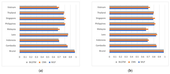 Figure 4 displays the accuracy chart of DNA sequence classification for the MLP, CNN, and BiLSTM models. When considering all available sequences, as depicted in Figure 4a, it is shown that sequences from Brunei can be distinguished from those of other ASEAN countries with almost perfect accuracy, reaching 98%. Conversely, the three countries with a lower accuracy are Indonesia, Malaysia, and Vietnam. This pattern remains relatively similar when exclusively involving the Delta variant in the dataset for each country, as shown in Figure 4b. Therefore, even though the variant is the same, the DNA sequences can still be differentiated based on the country of origin.