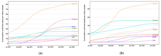 (a) Cumulative confirmed cases per million people and (b) cumulative deaths per million people in ASEAN countries during the second half of 2021.