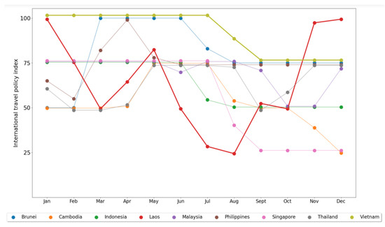 Monthly average international travel policy index in each ASEAN country throughout the year 2021.