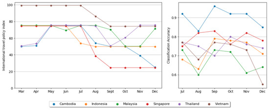 The implemented international travel policy index in ASEAN selected countries up to 4 months before the DNA sequence collection date and monthly DNA sequence classification accuracy in corresponding countries.