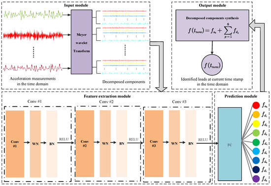 In the input module, the response in time domain, i.e., a i ( t ) , i = 1 , 2 , , N for N different acceleration measurement points in a certain time window are transformed into wavelet domain using Meyer wavelet. In total, 9 of 16 decomposed components of the wavelet are used in the network for each a i ( t ) , i = 1 , 2 , , N . In the feature-extraction module, the convolutions designed with batch normalization and weight normalization would extract the data-driven features in the wavelet domain. In the prediction module, the learned wavelet domain features are used for predict the load in the wavelet domain, i.e., the 9 decomposed components. Finally, in the output module, the load in wavelet domain is transformed back to the time domain. Details of the proposed network is given in Section 2.2.