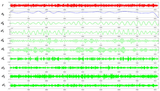 For each response measurement a i ( t ) , i = 1 , 2 , , N , the low frequency components at the 8-th scale a a 8 i , and all 8 high frequency components a d 1 i , a d 2 i , , a d 8 i are used for feature extraction. Therefore, for N measurement, there are 9 × N components are input to the feature extraction module, with 1 × N for low frequency components and 8 × N for high frequency components. Figure 2 gives an example of the original acceleration measurement signal and the decomposed components.