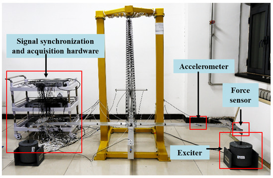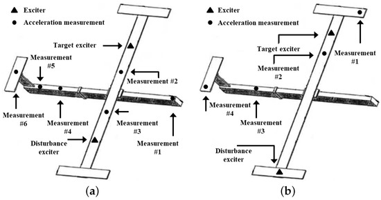 In order to collect the synchronized “load-response” data on the above-mentioned GARTEUR model, the vibration exciter, force sensor and the accelerometers are attached on the GARTEUR model. To evaluate the proposed approach under different response position configurations, in the experiments, two configurations of the accelerometers position are designed, namely the symmetrical distribution and the asymmetrical distribution. Figure 4 shows the sketch of the positions of the exciter and the accelerometers under the two configurations. For the symmetrical distribution, the vibration exciter with an attached force sensor is placed at the triangle point on Figure 4a. In the meanwhile, the acceleration response data are captured at six different positions, which are shown as the circle points on Figure 4a. As for the asymmetrical case, the exciter is placed at a different position, which is also shown as a triangle point on Figure 4b. To verify the identification performance under different numbers of measurement points, in this scenario, four accelerometers are used, which are placed on the circle points on Figure 4b. The Siemens LMS SCADAS III, which is from the Siemens LMS, Leuven, Belgium, is utilized for the temporal synchronization of the load and response signals.