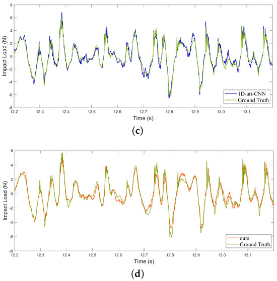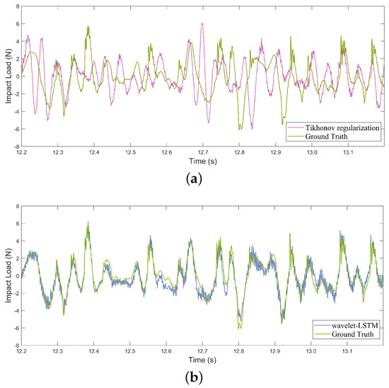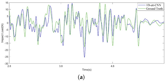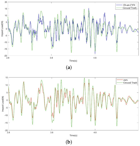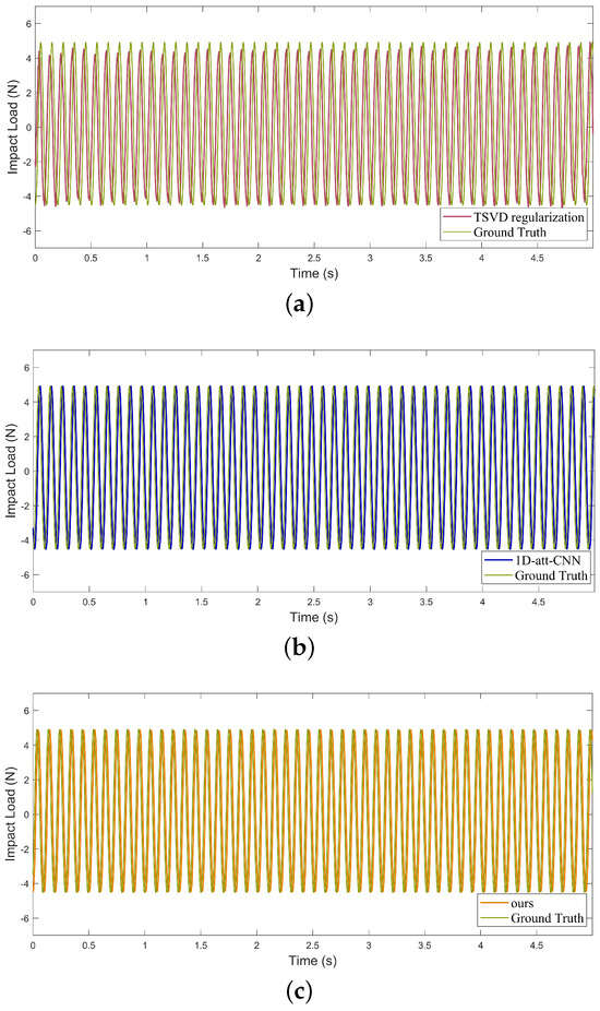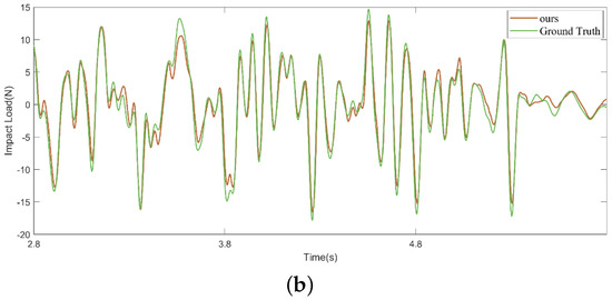 In the comparative experiments, the regularization parameters for TSVD and Tikhonov methods were obtained using the GCV method [45]. For the TDNN method [24], a three-layer shallow network was employed with the input being the time-domain vibration signal within a time window. The 1D-att-CNN method [25] used the described network structure with the input being the time-domain vibration signal within a time window, and the network structure consisted of two layers of stacked attention-based one-dimensional convolutional layers and one fully connected layer. For the wavelet-LSTM method [30], the network input was the 8th-order Meyer wavelet decomposition within a time window, consistent with the input of the proposed method. The network was designed with two layers of LSTM and one fully connected layer, with 128 neurons in the LSTM layer. To ensure fairness in the comparison, the time window for the original input of the neural network-based methods, including the proposed method, is set to 256. The learning rate and number of training epochs are set to be the same for all data-driven approaches. Table 3 provides quantitative comparison results of load identification for the proposed algorithm and the other comparative methods.