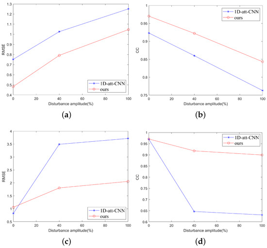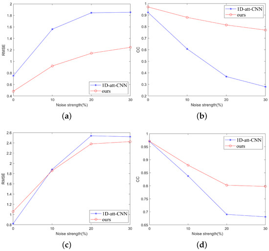 To compare the quantitative results, we choose the second-best approach in Section 3.2.1, namely the 1D-att-CNN [25] approach, for comparisons. From Table 6, it can be seen that for both cases of symmetrical and asymmetrical sensor distributions, the proposed method outperforms in terms of both metrics when the additional measurement noise exists. Figure 7 shows the changes in the RMSE and CC metrics when the noise strengths increase. From Figure 7b, it can be seen that for symmetrical sensor distributions, the CC metric of approach in [25] would decrease dramatically from 0.9232 when no additional measurements noised to 0.2794 when 30 % of the measurement noise. In the meantime, the proposed would remain above 0.75 at all noises strengths, which indicates more consistent identification results. For asymmetrical sensor distributions, though the approach in [25] can obtain a lower RMSE than that of the proposed approach when no additional measurement noises exists, when noises are added, the proposed approach outperforms in terms of the two metrics. Once again, the proposed would remain above 0.75 in CC at all noises strengths, which shows the robustness of the proposed method on additional measurements noises.