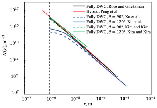 Drop size distributions, as given by Equation (6) with , for various applications are shown in Figure 1 from some sources in the literature. The original work has a size range defined by an effective and maximum radius of 0.001 mm and 0.45 mm, respectively, for [12]. The same drop size distribution was applied for of 90 and 120 degrees [16]. Both cases are for full-DWC surfaces without considering the effect of surface renewal. For DWC within a hybrid surface in [21], Equation (6) is used and is limited to DWC region width. The simulation work in [19] is performed in the presence of coalescence and re-nucleation, and data of drop size distribution for contact angles of 90 and 120 degrees are plotted for a 1 mm maximum radius. The discrepancy between [16] and [19] may be due to the consideration of coalescence and re-nucleation in [19].