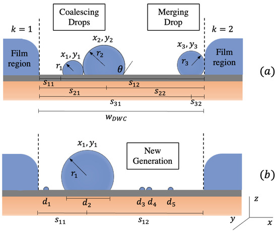 Dropwise and filmwise surfaces are integrated, and surface renewal is dependent on drops merging with neighboring films, as shown in Figure 2. It is assumed that the film region height is larger than the assigned maximum radius. Merging is detected when Equation (13) is met with either side of dropwise boundaries.