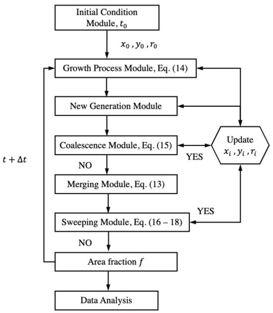 The simulation process is summarized in Figure 3. It includes all equations that are used during one run. The area fraction occupied by all drops is recorded for every time step for data regression and post-processing. The figure shows where all drop locations and sizes are updated throughout one-time intervals to ensure accuracy.