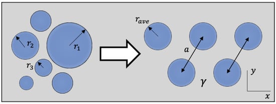 The average spacing between drops can be approximated by assuming all drops of the older generation are equal in size and uniformly distributed, as shown in Figure 4. The distances between their centers form an equilateral triangle [12], and the corresponding expression in terms of is given by