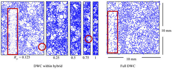 The simulation is also applicable for full-DWC regions when considering imaginary boundaries instead. Only a portion of drops occupied within the domain are accounted for in estimating , and Equation (15) is applied for all boundaries.