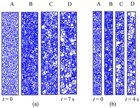 The simulation work is a reproductive process of drop growth and surface renewal. A demonstration for DWC within a hybrid surface with equaling (a) 0.5 and (b) 1 is shown in Figure 6. In initial condition phase A, all drops are randomly distributed without overlapping. When the simulation starts, the surface becomes more populated due to the generation of new drops and direct condensation, as indicated in phase B. Larger drops started to appear due to coalescence, and drop merging became obvious in phase C until the surface occupied by drops was minimal, as shown in phase D. Surface renewal was achieved in both cases, but we observed that it was faster at a higher value. Comparing cases (a) and (b) in Figure 6, the drops’ population density is close in each phase. However, the time cycle taken to reach phase D is shorter in case (b). This is because drops merging sideways into filmwise regions are more evident.
