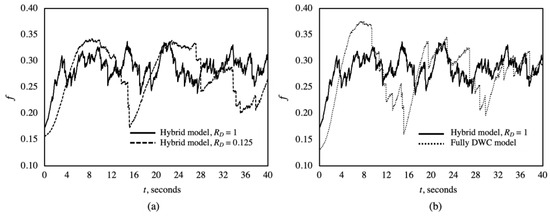 Area fraction fluctuation for simulation runs: (a) a comparison between the hybrid model at RD = 0.125 and 1; (b) a comparison between the hybrid model at RD = 1 and full DWC.