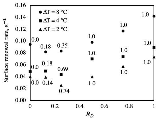 For each simulation run, the number of departing drops, their corresponding swept areas, and the sum of merging drops’ base areas are all recorded. The total surface renewal rates of sweeping and merging drops per unit area, s−1 are presented in Figure 9. As increases, surface renewal rates for DWC within the hybrid surface decline then rise for all . In comparison with full DWC, surface renewal within the hybrid surface is improved for 0.5. The shape of one surface renewal profile or curvature is due to the effect of merging drops. The contribution of merging is indicated by the fraction number at each condition in Figure 9. The value 0 implies that merging has no effect and sweeping is the only mode of surface renewal. When reaches unity, surface renewal rates are improved by 85% at and 64% at .