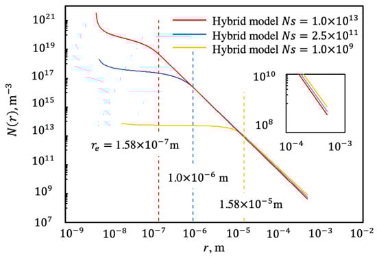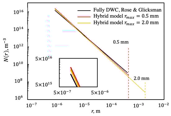 From Equation (2), the effective radius is dependent on the nucleation number that ranges from to sites/ and determines the population of small drops. Obtained values for n exponent are used in (9) to define the drop size distribution of small drops . The impact of variation on hybrid and is illustrated in Figure 11 for at 0.5 mm. The lower value reflects a steeper logarithmic slope and a lower value, which is presented in Figure 11 at . When coalescence starts at lower , it creates more area for more drops to nucleate and accelerates the process of coalescence. The percent change at is up to 85% between at and sites/. This is also because surface renewal due to sweeping and merging will result in more dry areas for more nucleation.