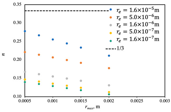 Outcomes from simulation work include sets of and values for various conditions. These values are curve-fitted in the form of Equation (24) to produce new values for exponent . The drop size distribution for small drops is obtained from the population model with respect to the contact angles and when applying the boundary conditions, as in Equations (7) and (8):