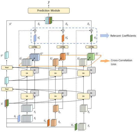 To be more specific, after learning intramodality information in the self-attention stage, the model utilizes Bi-LSTMs to transform unimodal feature sequences into feature representations , which are specific to each modality. Subsequently, we calculate relevant coefficients based on the correlation between this representation and the initial modal representations :