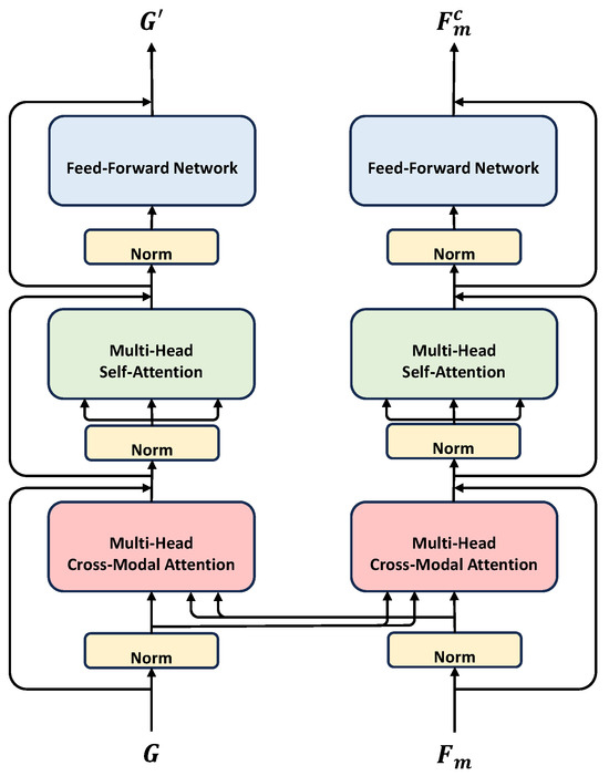 In MulT [30], the Query and K–V pair in the self-attention computation process come from different modalities. Thus, MulT captures the interaction between the two modalities. MulT combines three modality pairs and calculates bidirectional modality interactions for each pair. As shown in Equation (3), for two modality feature sequences and , MulT defines Query as , Key as , and Value as . It calculates cross-modal attention in two directions between a pair of modalities: