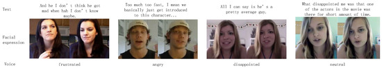 A multimodal dataset collects information from different modalities, such as text, speech, and vision, providing researchers with opportunities to gain a deeper understanding and analysis of sentiment expression. Three publicly available datasets are used in this article, including CMU-MOSI, CMU-MOSEI, and CH-SIMS. Figure 5 illustrates some samples from the CMU-MOSI and CMU-MOSEI datasets, and Figure 6 illustrates the CH-SIMS dataset.