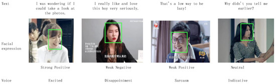 Examples in the CH-SIMS dataset. The green box in the image captures the speaker’s facial expression.