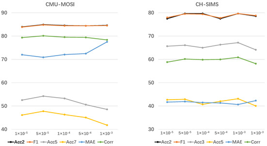 According to Table 9 and Table 10, it is evident that in multimodal fusion, the model’s performance significantly improves when unimodal features are augmented with relevant coefficients compared to direct concatenation. Specifically, there is a 1.5% improvement in Acc-7. Therefore, the use of relevant coefficients in the multimodal feature fusion stage enables the model to analyze the relations between the self-attention modality representations and the source feature representations, and, thus, to achieve higher accuracy on multiclassification.