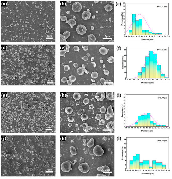 The mass ratio of PCL to CS in the solution is one of the most important factors in particle generation. When the mass ratio of PCL:CS was 7:1, the number of particles produced by the spraying process was very small, which can be inferred from the images (Figure 1j–l), due to the fact that PCL is easily soluble in the aqueous solution of THF and glacial acetic acid; a large amount of PCL in the large mass ratio of PCL is sprayed directly onto the receiver plate to solidify and does not bind with CS to form particles, and the small amount of particles formed by CS also forms irregular concave cake-like particles in the process. When the ratio of PCL:CS was reduced to 3:1 (Figure 1d–f), the state of the microparticles changed significantly and bowl-shaped MPs with regular morphology were formed, and when the mass ratio was reduced to 1:1 (Figure 1m–o), although a few of the formed microparticles had the morphology of bowl-shaped microparticles, adhesion of particles caused by a large amount of chitosan and the direct formation of particles by chitosan were very obvious.