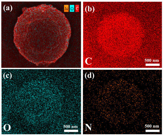 The elemental distribution of CS/PCL MPs is shown in Figure 2, where the three elements C, N, and O are uniformly distributed; since only CS contains nitrogen in PCL ((C6H10O2)n) and CS ((C6H11NO4)n), it can be demonstrated that chitosan and polycaprolactone are uniformly distributed in the particles.