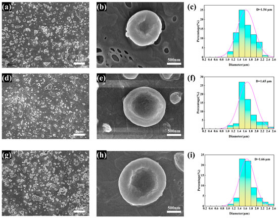 The variation in microscopic morphology in the obtained CS/PCL bowl-shaped particles with solution concentration and solute ratio is shown in Figure 1. When spherical particles begin to dry, because the droplet movement process of the outside of the contact with air flow velocity is faster, the outer layer of the droplet first dries and solidifies, and then forms a solid “shell”, so that the volume of the internal changes is not immediately reflected in the external shape. However, as the interior of the droplet also begins to dry, the solute left behind by the drying of the solution inside is not enough to fill the internal structure, resulting in the formation of a cavity inside the droplet. Eventually, the cavity collapses and the whole sphere collapses into a bowl shape [36,37]. At a solution concentration of 3% (Figure 1a–c), due to the low solute content, low solution viscosity, and small diameter of the atomised droplets, the drying rate inside and outside the droplets is similar, and no cavities are formed, resulting in fewer and smaller-diameter bowl-shaped particles. At a solute concentration of 4% (Figure 1d–f), a large number of regular bowl-shaped particles are produced. This is due to the moderate droplet diameter and the large difference in drying rates between the inside and outside; the particles are highly collapsed and flattened with one side concave. When the solute concentration is increased to 5% (Figure 1g–i), the mass of the solute in the atomised droplets increases with the increase in mass volume fraction, resulting in larger particle diameters and thicker walls.
