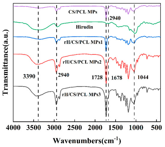 The FTIR spectra of hirudin, CS/PCL MPs, and rH/CS/PCL MPs are shown in Figure 4. Among them, PCL is the most abundant and therefore its characteristic spectrum dominates, producing sharp peaks in the band region in the range of 1720–1740 cm−1 due to carbonyl stretching vibration; the C–H stretching vibration peak of saturated hydrocarbons appears near 2940 cm−1 [38]. The broad and absorption peaks at 3390 cm−1 and 1044 cm−1 are attributed to N–H and C–O in chitosan [39]. Comparing the IR spectra of hirudin in Figure 4, the two characteristic peaks of rH/CS/PCL MPs at 1678 cm−1 and 3123–3692 cm−1 were further enhanced due to the fact that hirudin is also rich in –NH and –C=C. This indicates that hirudin was successfully immobilised in CS/PCL MPs and that the amount of hirudin immobilised increased as the concentration of the hirudin solution increased [40].