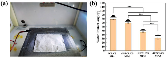 Macroscopic morphology of the rH/CS/PCL MPs3 layer: (a). Hydrophobic angle test plot of CS/PCL MPs, rH/CS/PCL MPs1, rH/CS/PCL MPs2 and rH/CS/PCL MPs3: (b), n = 3. *** p < 0.001.