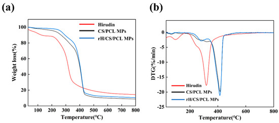 Thermogravimetric Analysis (TGA) (a) and Derivative Thermogravimetry (DTG) (b) curves of hirudin, CS/PCL MPs and rH/CS/PCL MPs3.