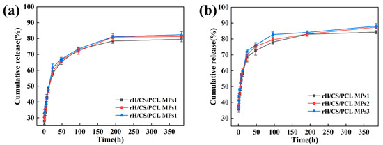 Cumulative release of rH from rH/CS/PCL MPs (a) pH = 7.2 and (b) pH = 5.8, n = 3.